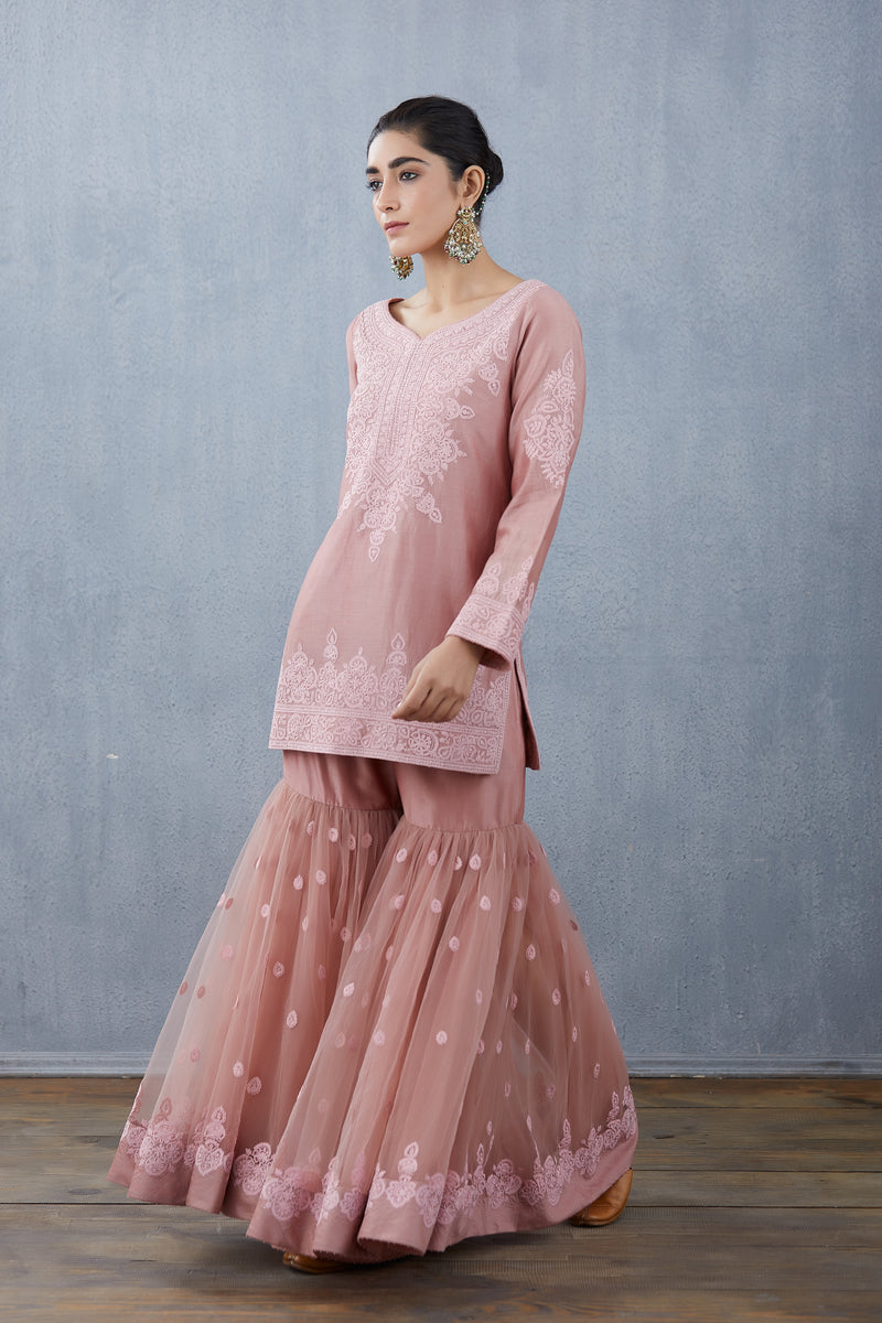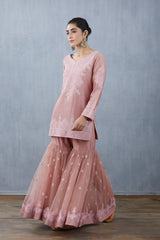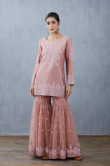The Gulbahar Vedika Sharara Set is a classic combination of style and elegance. Crafted from a luxurious mix of Handwoven Chanderi, Cotton Silk, and Butterfly Net fabrics, this set features exquisite Dori Embroidery and Hand Adda Work. The beautiful, bright pink color adds extra glamour, while the ensemble of Kurta, Sharara, and Odhni makes it perfect for special occasions.