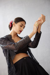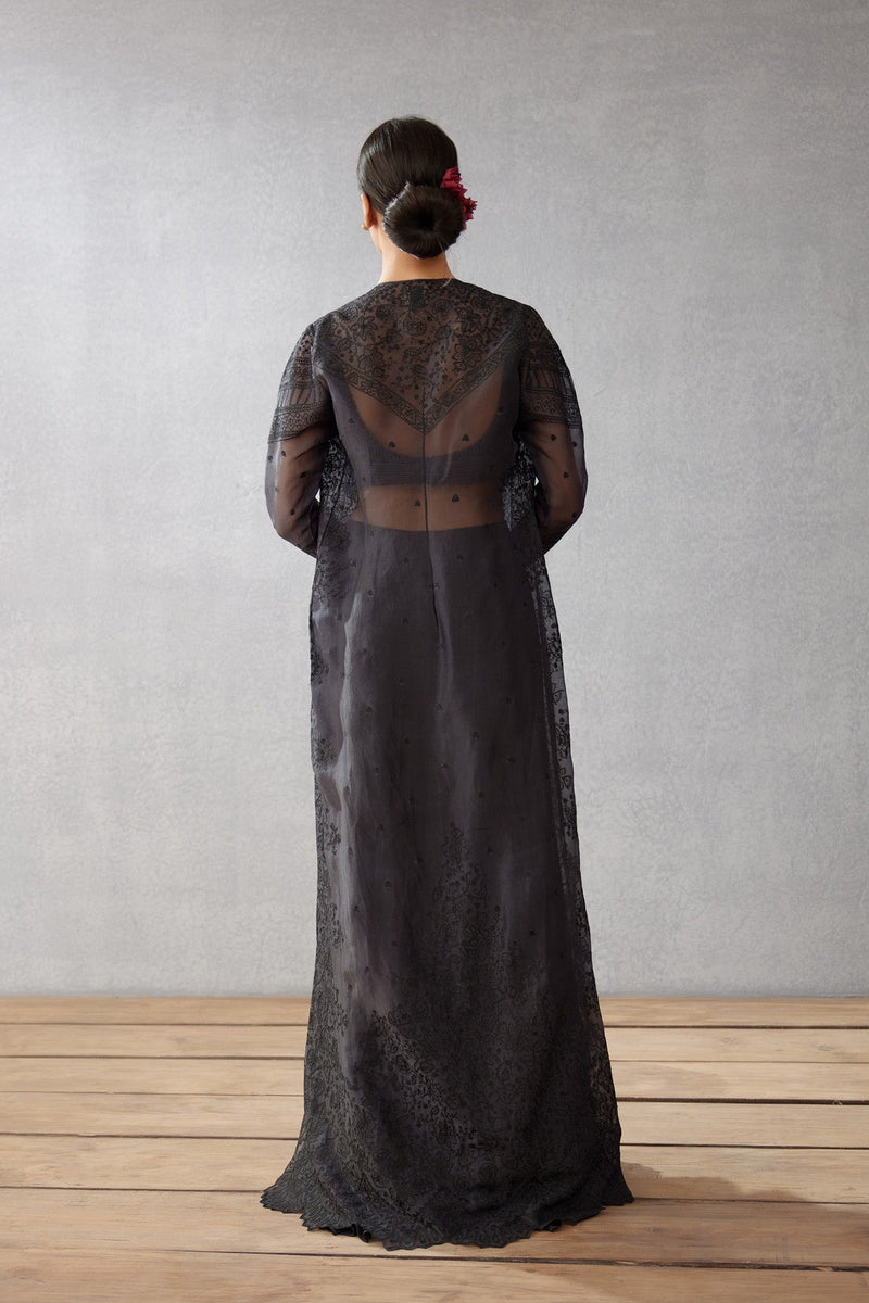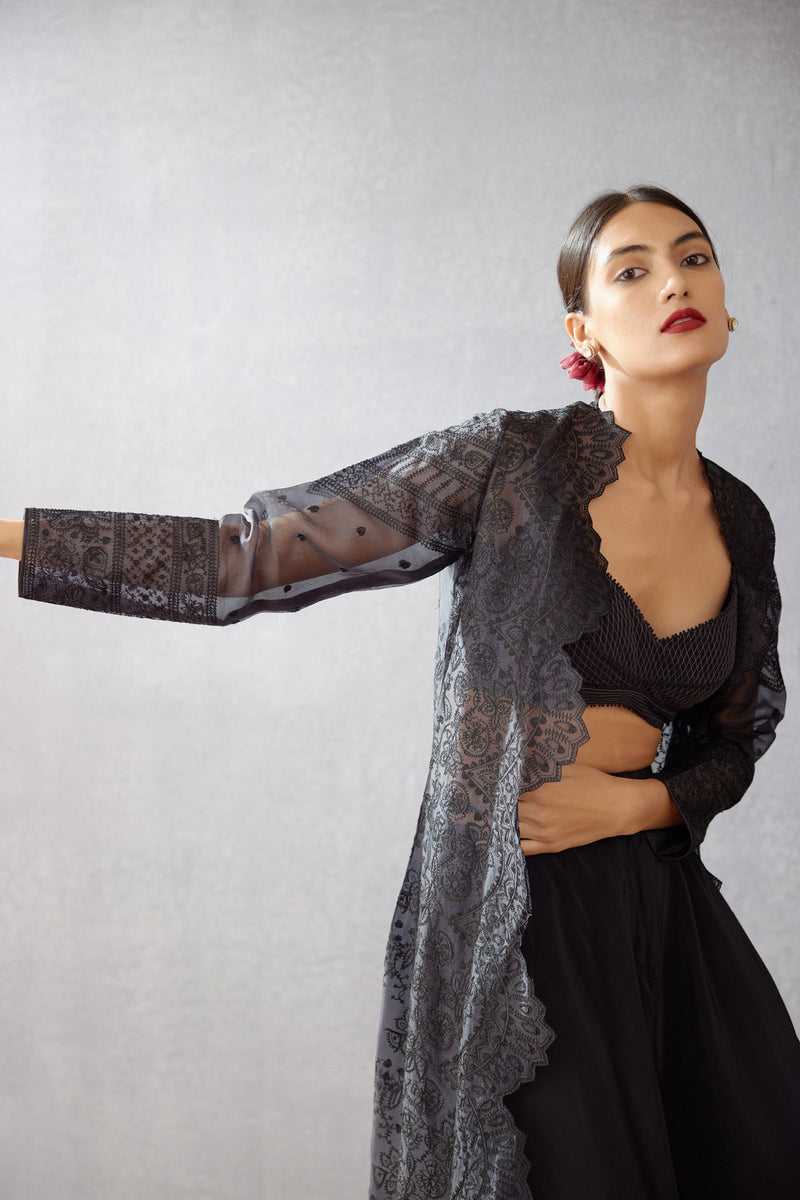This Gulghast Daavya Cape is perfect for any special event. Crafted from luxurious fabric details like ebony black Silk Organza it is highlighted with intricate Aari Embroidery. You'll feel glamorous and refined in this timeless look.