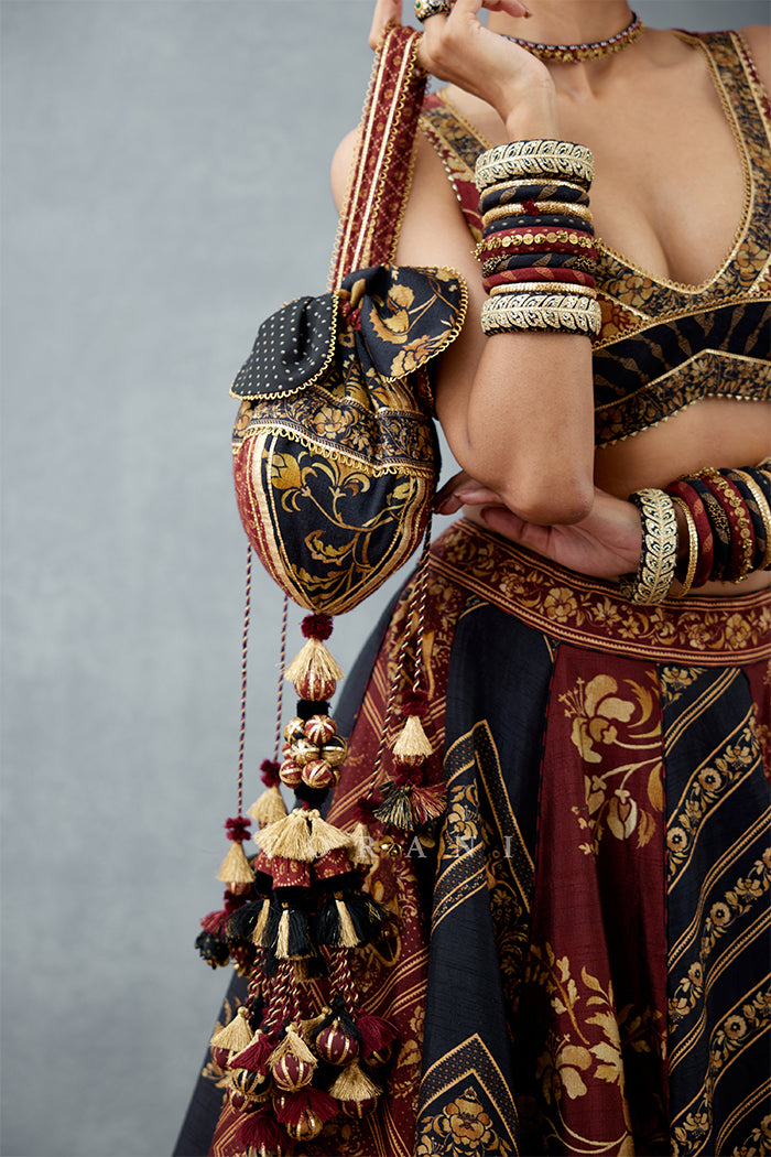 This Gulghast Farida Potli is an exquisite combination of comfort and style. Soft and luxurious Slub Silk meets bold jet black fabric for a potli that wraps you in elegance. Featuring digitally Bhagalpuri printed banana leaf pattern adorned with Gota embroidery, this beautiful bag is perfect for any special occasion.