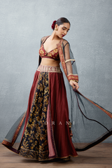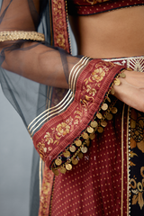 Elegantly crafted for special occasions, the Gulghast Fatima Farhat Cape Set is a must-have for fashionistas. It features a jet-black plain cape set with little gota detailing in butterfly net, and a sharara and bralette of slub silk. The unique digital Bhagalpuri print in black and red gives this set a timeless look. Make a lasting impression with this exquisite set.