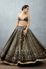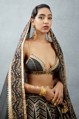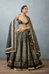 This Gulghast Hayat Lehenga Set is perfect for special occasions. Made from pure Bhagalpuri Silk, it features Jet Black and Gota Embroidery designs, Hand Adda Work, Bhagalpuri Digital Print, and Heavy Tassel Strings. It includes a lehenga, blouse, and dupatta, making it a complete set for your next event.