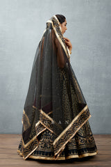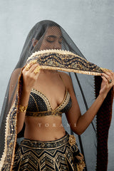 The Gulghast Noor Odhni is a jet black polka dotted Odhni in luxurious Silk Organza fabric. The printed Lehariya border is finished among golden fringes, perfect for adding a touch of elegance to any traditional outfit. The Silk Organza fabric ensures a light and airy feel, and helps the Odhni drape gracefully.