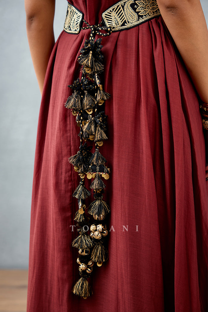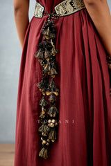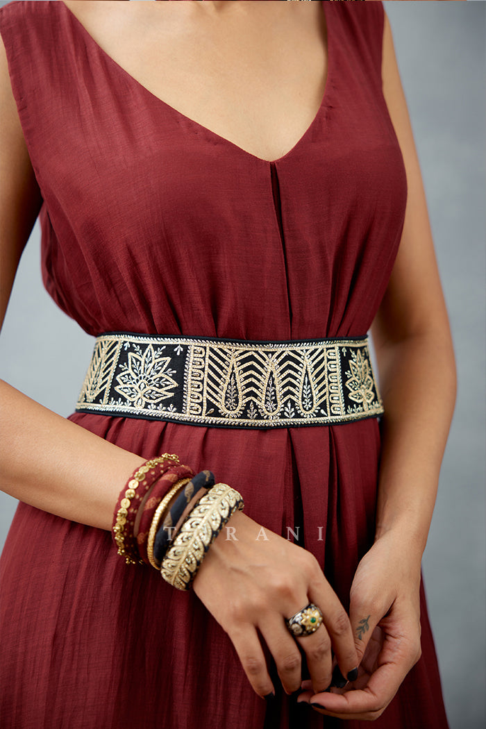 Make a statement with this Gulghast Rizwana Kamarbandh. Crafted from Slub Silk, its timeless jet black hue is adorned with intricately embroidered Gota detailing for an elevated look. Perfect for any formal occasion, this belt includes a clasp closure for a secure yet stylish finish.