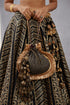 This Gulghast Sajida Potli is crafted from Slub Silk and features a unique jet black Bhagalpuri print. It is expertly crafted with Gota embroidery and traditional Hand Adda work, making it a beautiful and timeless piece. The potli comes with a stylish bag, making it an ideal choice for any special occasion.