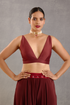 The Gulnar Daavya Blouse is made of luxurious, handwoven Chanderi and cotton silk fabric in a vibrant red shade. Its deep front neck bralette adds an elegant flair and creates a flattering, timeless silhouette. It's a perfect statement piece for any wardrobe.