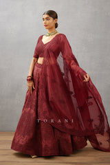 Make a statement with this gorgeous Gulnar Meher Passa Lehenga Set. Crafted out of burgundy butterfly net with dori embroidery and hand adda work, the set includes a lehenga, blouse, and dupatta. Each garment is finished with cotton silk and silk organza, ensuring a comfortable and luxurious fit. Stand out in these vibrant red tones and define your look.