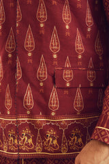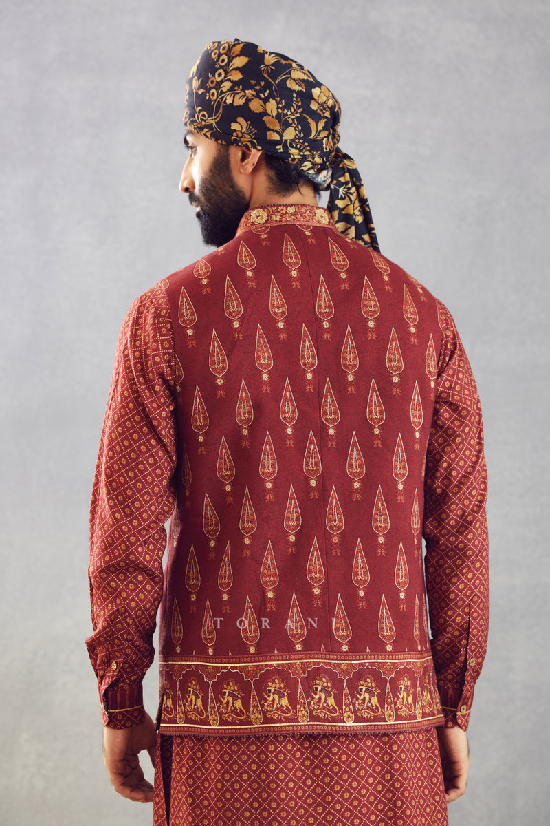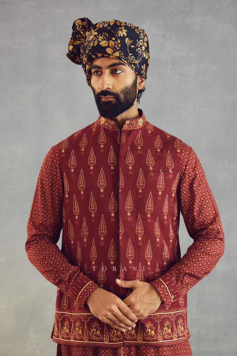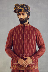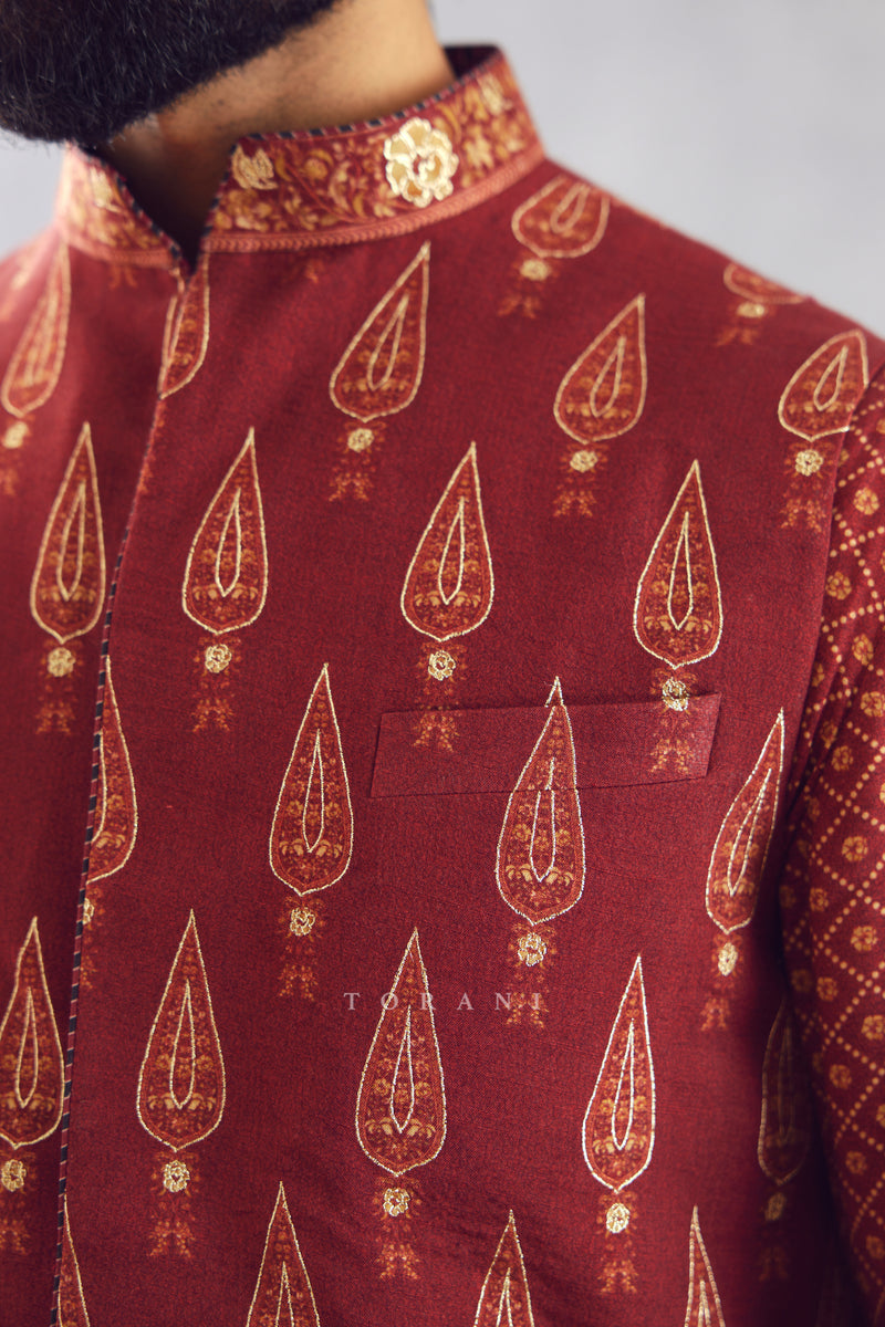 Introducing the Gulnar Zain Bandi, with a red-hue and a beautiful combination of Slub Silk, Cotton Silk materials that are accented with elegant Gota Embroidery and Digital Bhagalpuri Print details. Perfect for any festive occasion!