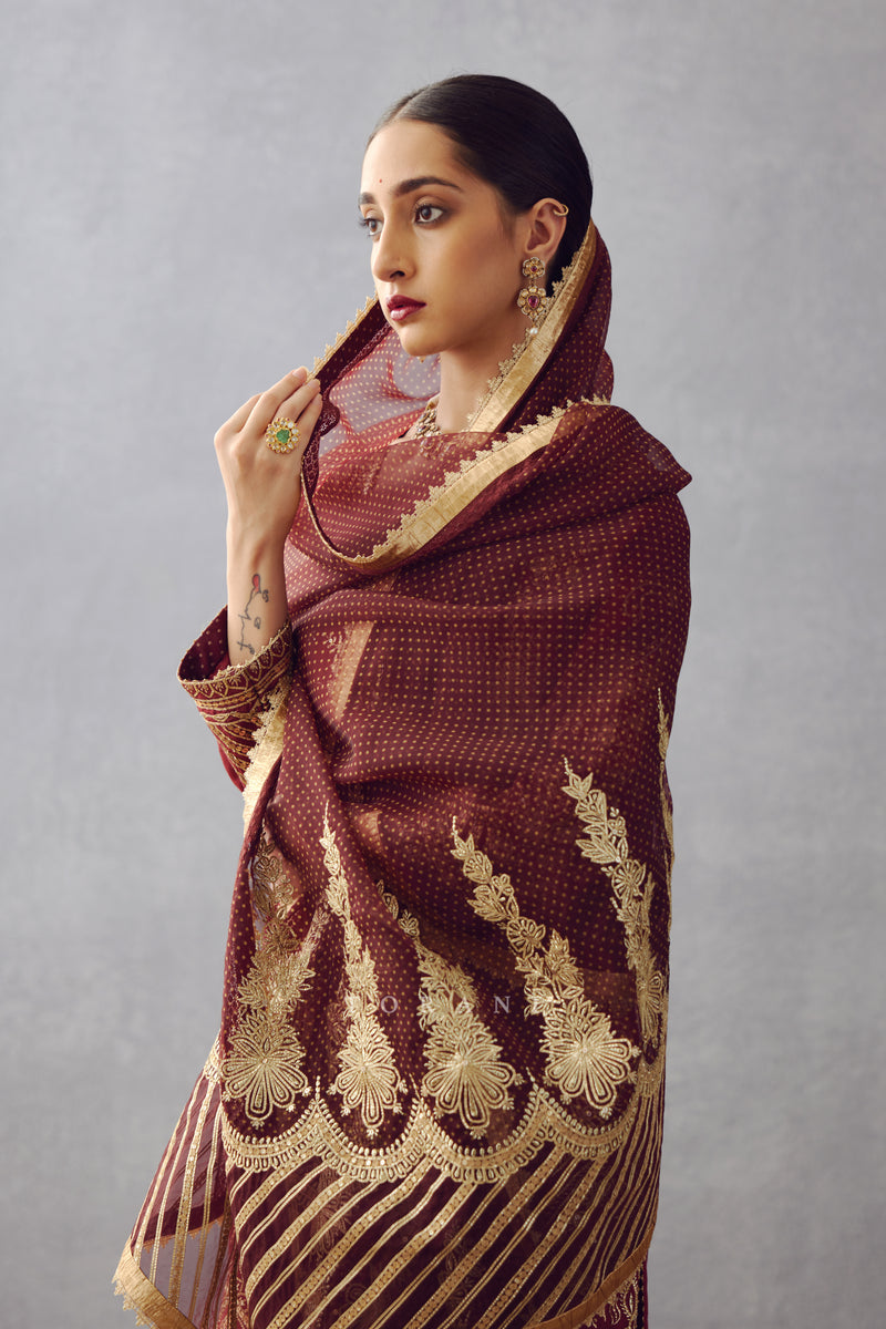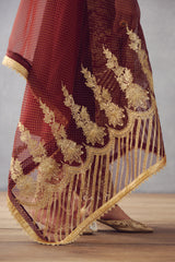 The Gulnar Zarin Odhni is a beautiful burgundy Odhni crafted from Silk Organza and featuring intricate Gota detailing. This lightweight textile evokes royalty with its digital Bhagalpuri print and Hand Adda work. The perfect addition to your wardrobe for special occasions.
