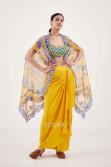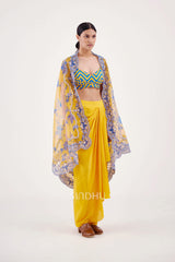 A free-size sheer cape, adorned with scalloped edges and delicate floral embroidery in our signature hues of Marigold and Lapis. It is paired with our Hiru Bralette and Sure Dhoti Skirt for an ensemble that speaks effortless elegance.