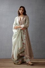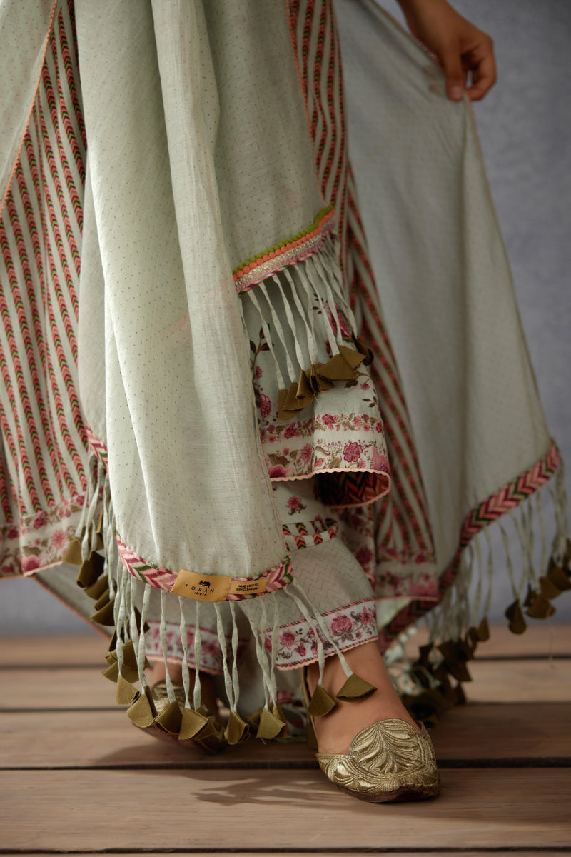 Jaituni Bushra Odhni is the perfect choice for those seeking a traditional, sophisticated style. With its sage green color and Hand Block printed design, it provides a timeless elegance to any outfit. Crafted with Handwoven Thin Chanderi fabric and multiple tassels, you'll look beautiful no matter the occasion.