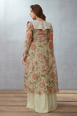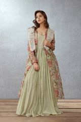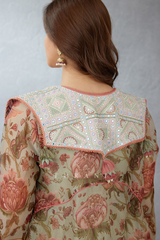 The Jaituni Koshi Balochi Cape Set makes a statement in green Silk Organza featuring sage green Chintz printed Machine embroidered sheer cape and dress.  Relying on Digital print, Hand embroidery, and Hand Adda work, this piece of apparel promises to make you stand out in the crowd.