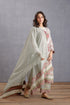 This Jaituni Samar Odhni is made from Cotton Kota, offering a breathable, lightweight feel for added comfort. The sage green Hand Block printing is paired with beautiful embroidered Organza panel, creating a perfect blend of colors. It is crafted with a unique combination of Digital print, Hand Block printing, Machine embroidery and Hand work.