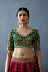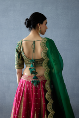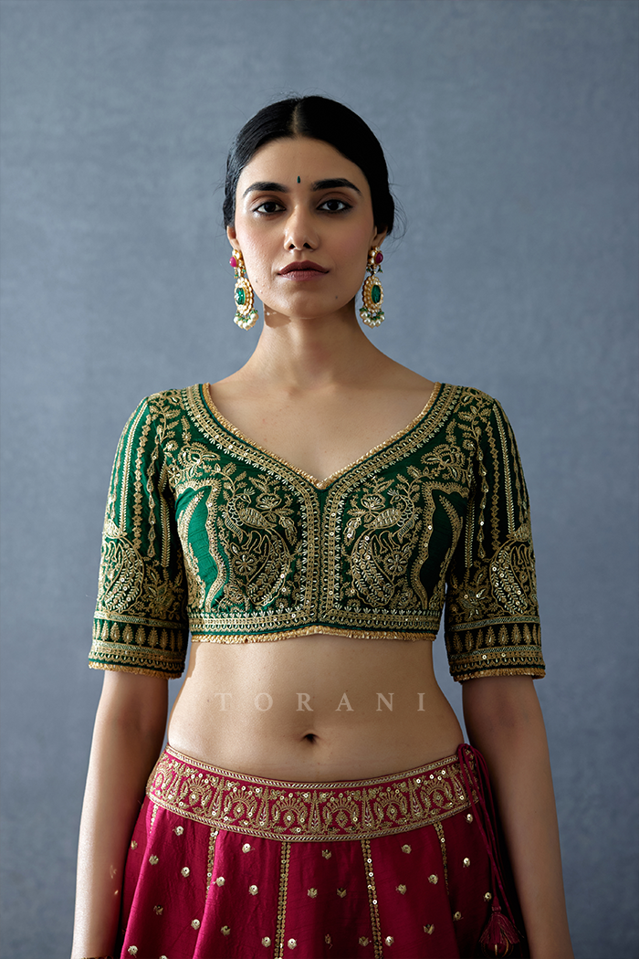 The Kachi Keri Rifah Blouse is made from raw silk and cotton silk in a gorgeous jewel tone to fit the festive aesthetic. The elegant blouse is hand embroidered with gota and zari and includes intricate hand adda work. With an exquisite combination of traditional craftsmanship and modern techniques, donning this lehenga will feel like a gateway into luxury.