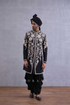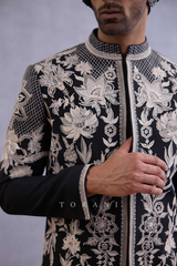 The Kalamkari Achintya Sherwani is crafted with a luxurious jeni silk fabric for your summer wardrobe. The piece boasts intricate floral embroidery for an exquisite look for the season.