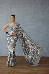 The Kalamkari Imara Saree is digitally printed with signature Torani chintz motifs in a jaal-style. Crafted with a luxurious handwoven chanderi fabric, this saree is also accented with detailed hand work, embroidered border and scallop detailing. The monochrome saree is ideal for the summers.