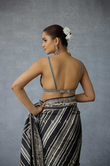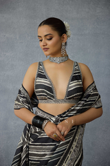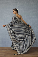 The Kalamkari Myra Saree is crafted with a lightweight diamond silk fabric detailed with digitally printed black & Ivory stripes. It is further unrated with hand work technique, to add a luxurious touch to this distinct piece.
