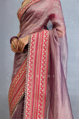 The Kaner Manjari Saree is crafted from shimmer organza tissue, exuding elegance for any festive occasion. It is intricately embroidered with dori work, dabka, sequins, and pearl details, creating a truly exceptional look.