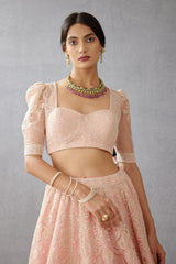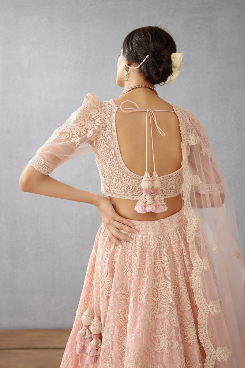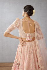The Kaner Meher Passa Blouse is a sophisticated choice for special occasions. It features a cotton silk and butterfly net blouse. The pink ensemble is detailed with intricate dori embroidery for a timeless look.