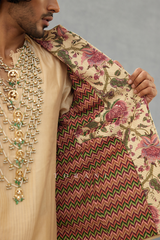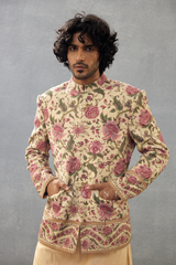 Enhance your wardrobe with the Kasturi Mehtab Jacket. Crafted from a luxurious blend of handwoven Chanderi and cotton silk, this jacket is highlighted with a unique combination of quilting, digital print and handblock print for a truly special look. Available in a timeless beige color, this piece will be a stylish addition to any wardrobe.