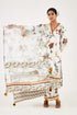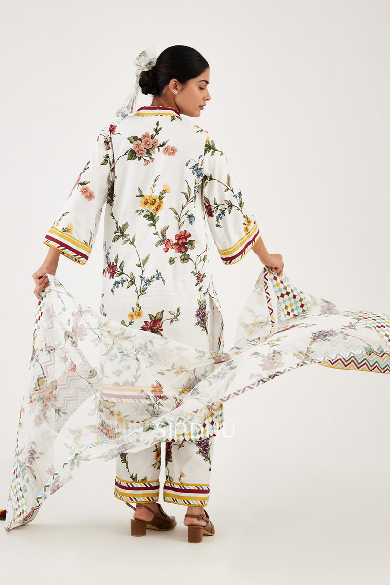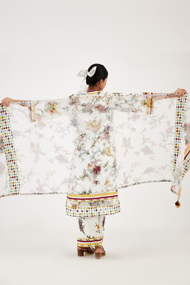 A graceful addition to your ensembles, this sheer organza dupatta in sparkling white features motifs of multicolor florals and checks. Goes perfectly with our Champa Tunic and Karula Wide-leg Pants.