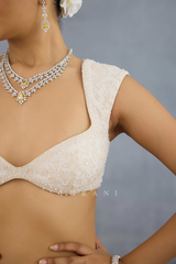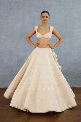 Inspired from the traditional Gujarati choli, this Maahe Mumtaz Blouse is the perfect mix of tradition and modernity. Pair it with your choice of attire- the lush Jeni Silk is embroidered in beautiful Doria to create the perfect luxury companion.
