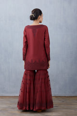 Up your ethnic game with this exquisite Mahogany Vedika Sharara Set. Crafted from handwoven Chanderi, Cotton Silk and Butterfly Net, this wine-colored set is artfully embellished with delicate Dori Embroidery and intricate Hand Block Print. It comes with a kurta, a sharara and an odhni, giving you an elegant and sophisticated look.