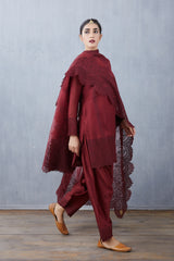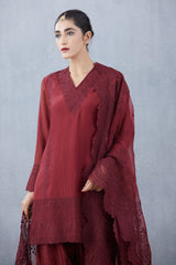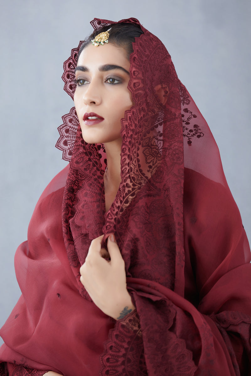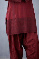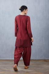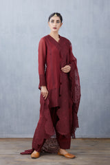 This contemporary Mahogany Sloka Kurta Set is made of a luxe fabric blend of Handwoven Thin Chanderi, Cotton Silk, and Silk Organza. The kurta features Aari embroidery and hand block print accents, and includes the kurta, slip, pants, and Odhni. This set has a deep wine color for a timeless and elegant look.