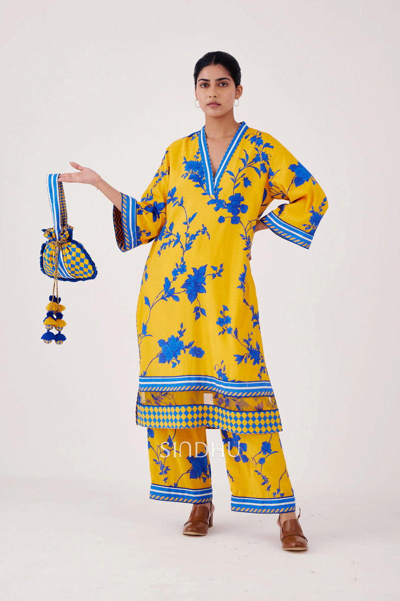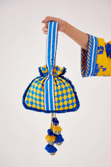 Checkered Potli in our signature hues of Marigold and Lapis. Finished with tie-up of tassels and frills. Pair it with our breezy co-ord sets for a boho-chic look.