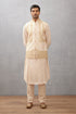 Look sharp in the Mogra Murshid Bandi Set. Constructed with luxurious handwoven chanderi, slub silk and cotton silk fabric and decorated with aari embroidery and pintuck work. This set contains a bandi, kurta and pants, all in ivory. Perfect for formal occasions.