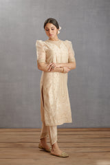 This Mogra Ojal Kurta Set is an exquisite choice for your traditional wardrobe. Crafted from handwoven Chanderi, Cotton Silk, and Silk Organza fabric, this set includes a Kurta, Pants, and Odhni, all adorned with intricate Hand Embroidery and Hand Adda Work. Its classic ivory hue looks stunning and timeless.
