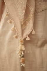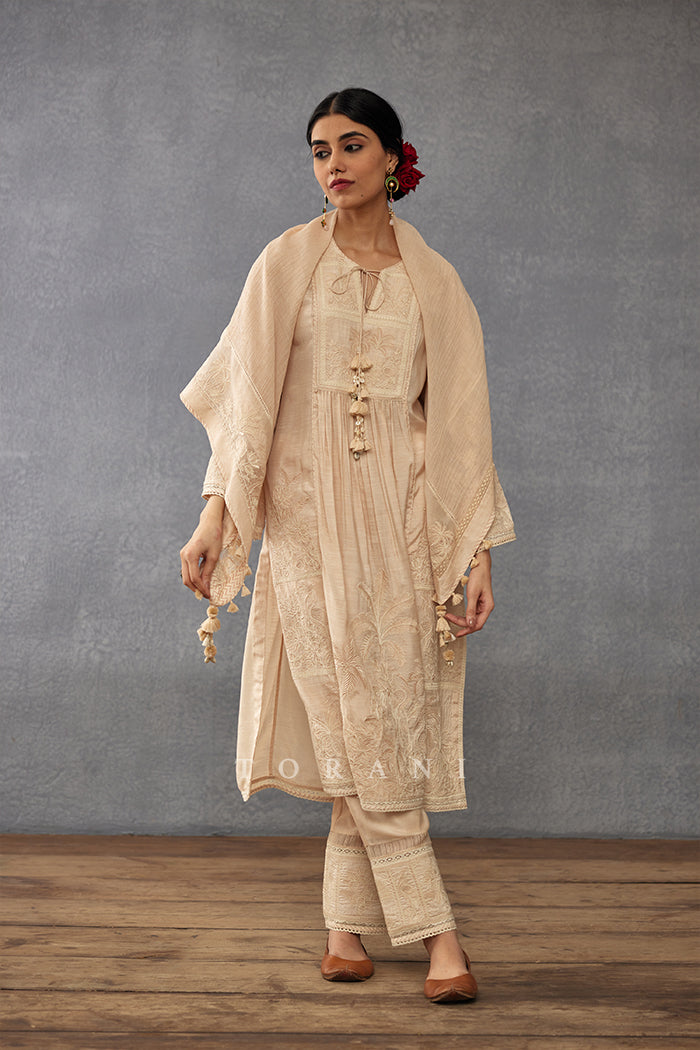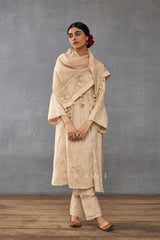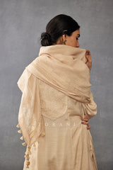 The Mradu Amaali Scarf is a unique blend of traditional designs with modern day fashion. Crafted from a lightweight blend of Handwoven Chanderi and Cotton Silk, these scarves feature a beautiful Hand Block print combined with intricate Hand embroidery. Perfect for any occasion, the beige color scheme adds a subtle and classic touch to your wardrobe.