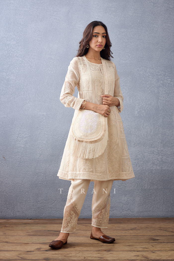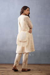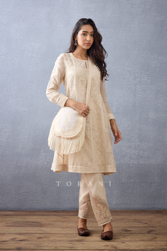 This Mradu Yara Bag is crafted from a luxurious blend of Slub silk and Handwoven Chanderi fabric, resulting in a durable yet lightweight texture. The bag features beautiful Hand embroidery in a classic beige hue, perfect for adding a sophisticated touch to any ensemble.