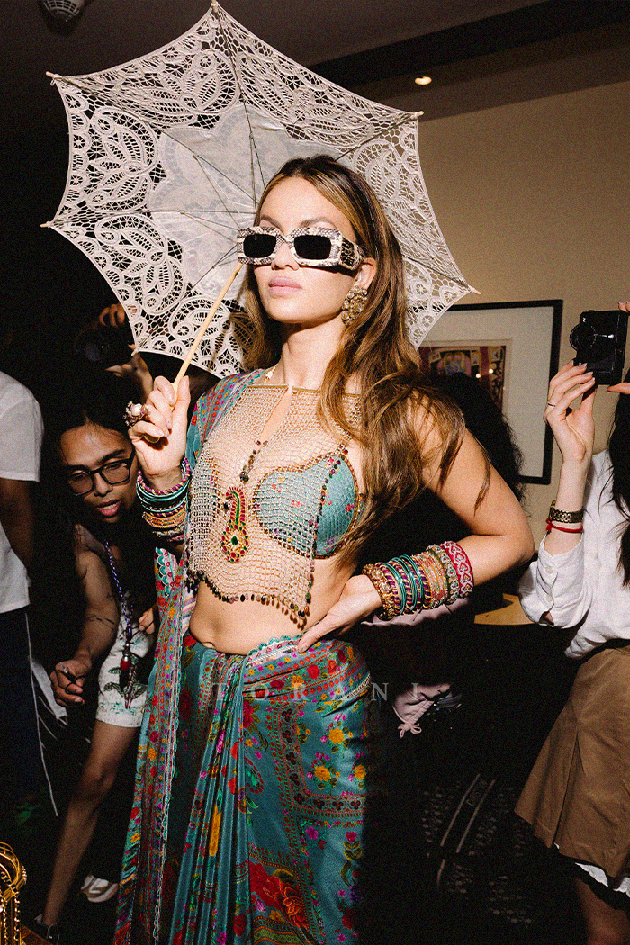 Note: The brooch and netted accessory Natasha Poonawalla is wearing are not Torani pieces.