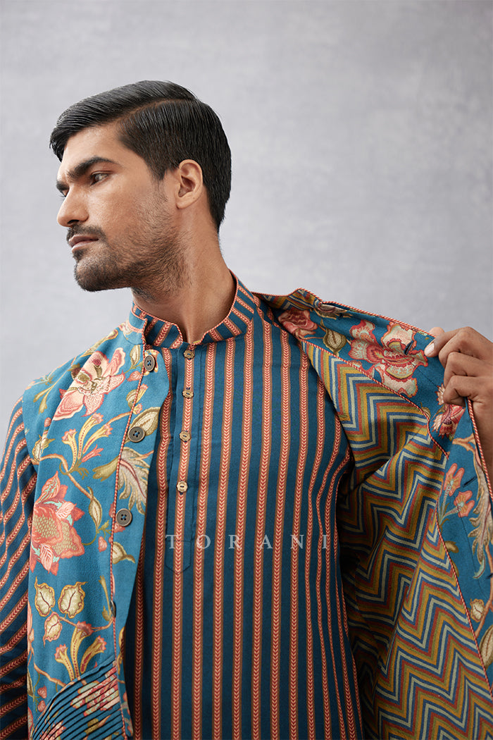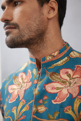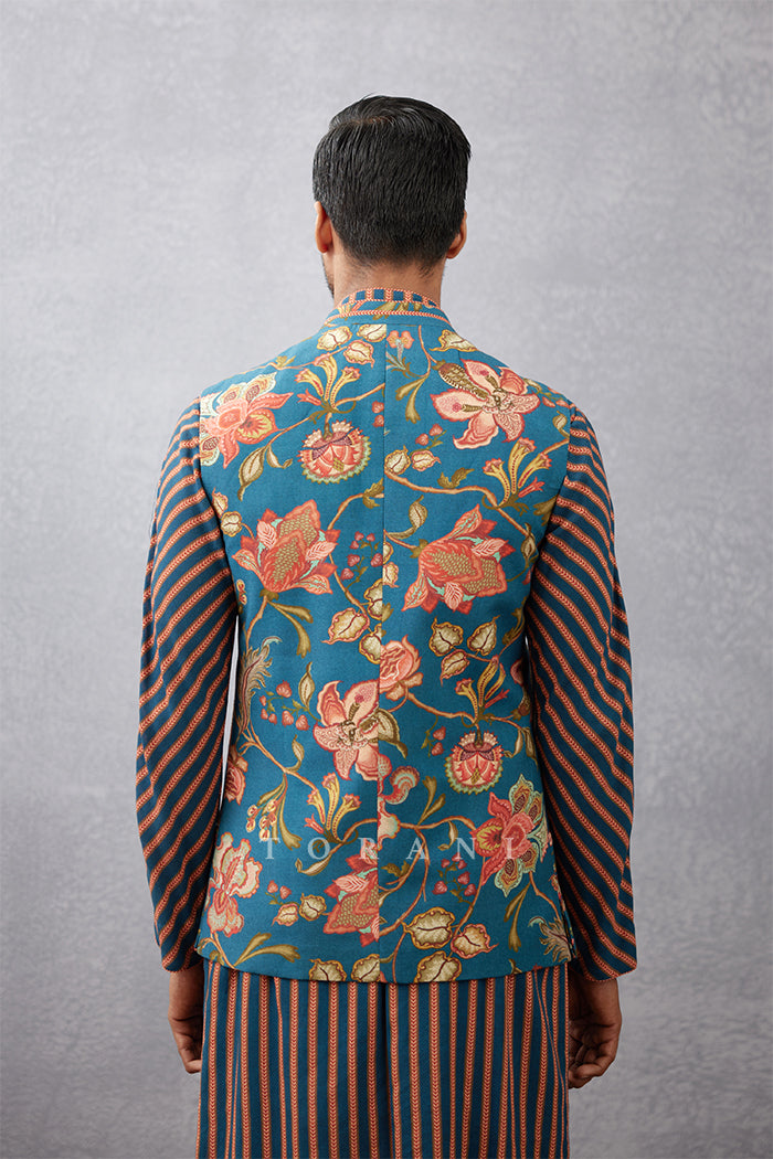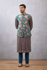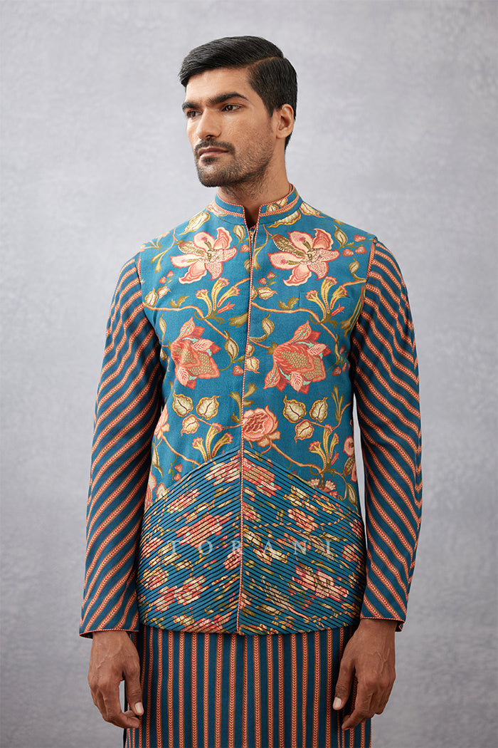 Neelam Faiz Bandi is crafted from a superior quality cotton silk blend fabric. The blue color and digital print-quilting work set this piece apart. Enjoy an elegant, lightweight look and feel that flatters your silhouette.