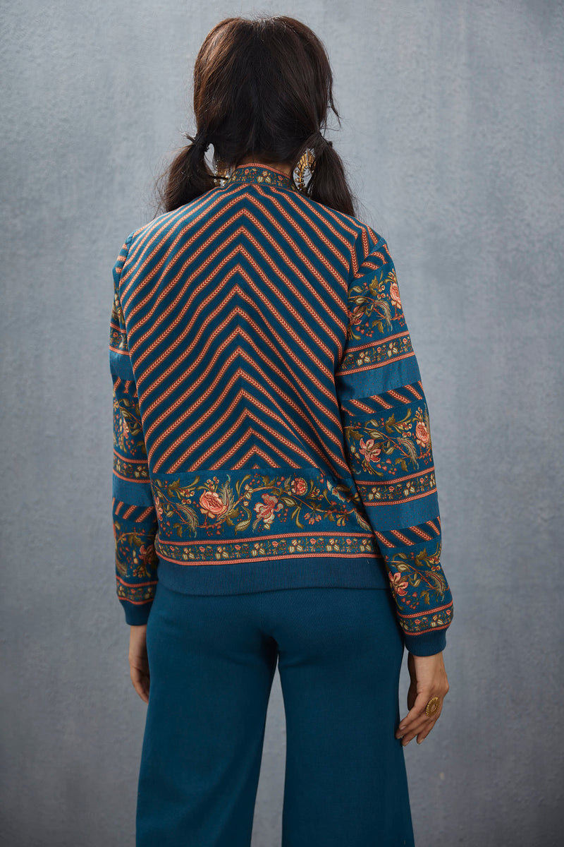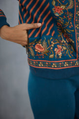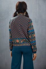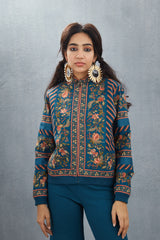 The Neelam Smita Bomber Jacket is beautifully crafted with a luxuriously soft Handwoven Chanderi and Cotton Silk fabric. This statement piece features a stunning Digital print in a navy blue color. Perfect for an elegant, fashionable look.