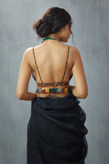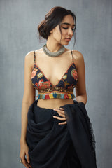 This Nisha Yuvani Bralette is a stunning addition to your wardrobe. It is handmade with handwoven Chanderi silk fabric that is both durable and lightweight. The elegant black color is accented with artfully designed digital print work. Look your best in this exquisite bralette.