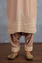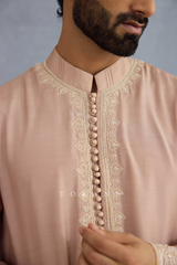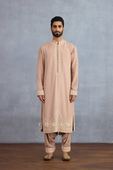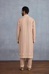 The Noore Yaar Kurta Set is crafted with the finest muslin silk and features a peach color, elevated with tonal dori, dabka, and other embellishments for a distinctive finish. The set includes a kurta and salwar, rooted in the heritage traditions of Indian menswear.