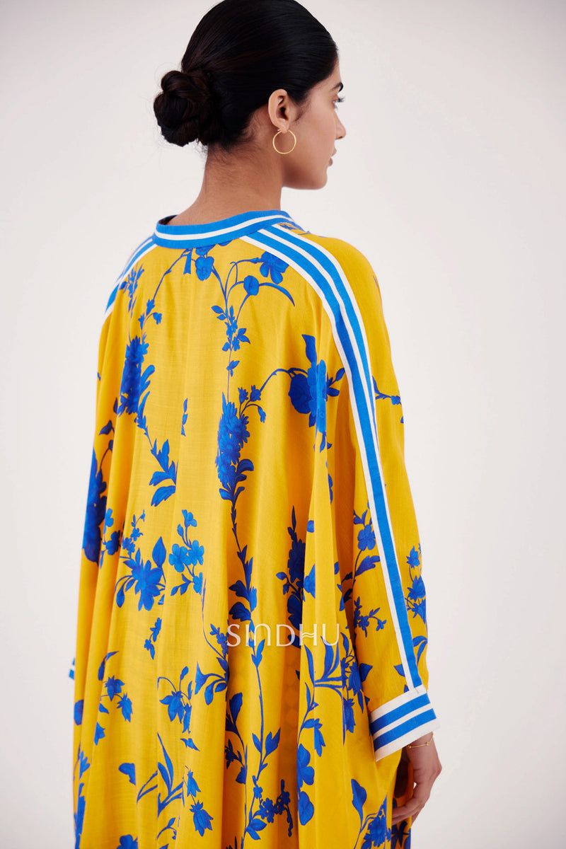 The Oshin Co-ord Set is crafted with a luxurious slub silk fabric for a stylish look. Fluid to style, the relaxed, hanky hem button-down tunic of this set features a striking cobalt blue floral print on vivid yellow. It is paired with Enka Checkered Pants from our collection for a light and breezy fit.