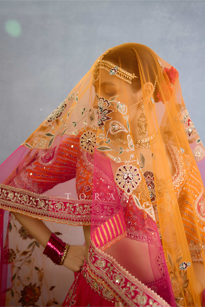 The Padma-Pukhraj Chandra Odhni is a luxurious piece crafted with sheer butterfly net and hand embroidered all over with pearl, dori and zari embellishments. This one is truly crafted for your special occasions.