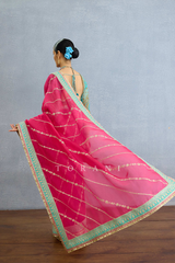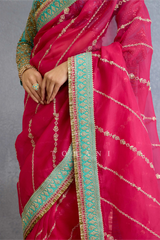 The Padma Ramani Saree is crafted with pure organza fabric along with a Jeni silk border. It is embroidered with intricate dori work, traditional dabka and badla work in rose gold and gold threads, and pearl details. This pink saree is a gorgeous addition to your festive wardrobe for its shade and exquisite work.