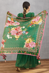 The Panna Chokor Guncha Scarf is made of luxurious Handwoven Chanderi and pure Silk Organza fabrics in a stunning emerald green hue. It's lightweight, breathable, and its exquisite craftsmanship ensures it will be an eye-catching piece to add to your wardrobe.