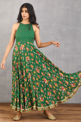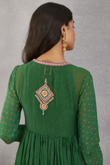 This Panna Mariyam Cape Set features an Angarika made of thin Handwoven Chanderi, an Anarkali made of Cotton Silk and Handwoven Chanderi, and matching Pants & Odhni in Cotton Silk and Cotton Voile. It comes in the luxurious emerald green color, for a timeless, sophisticated look.