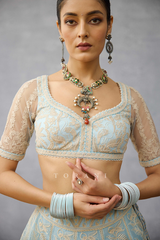 The gorgeous Pushkar Advika Blouse is made of a soft butterfly net, delicately hand-embroidered and dori embroidered upon a soft powder blue shade. Perfect for any special occasion, it is sure to be the highlight of your outfit.