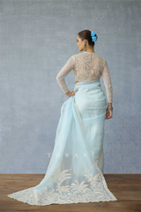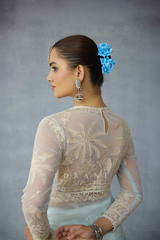 Crafted with a delicate butterfly net fabric, the Pushkar Indira Blouse is intricately decorated with signature Torani motifs embroidered on the soft powder blue. Add this blouse to your wardrobe and steal the spotlight with your ethereal look.