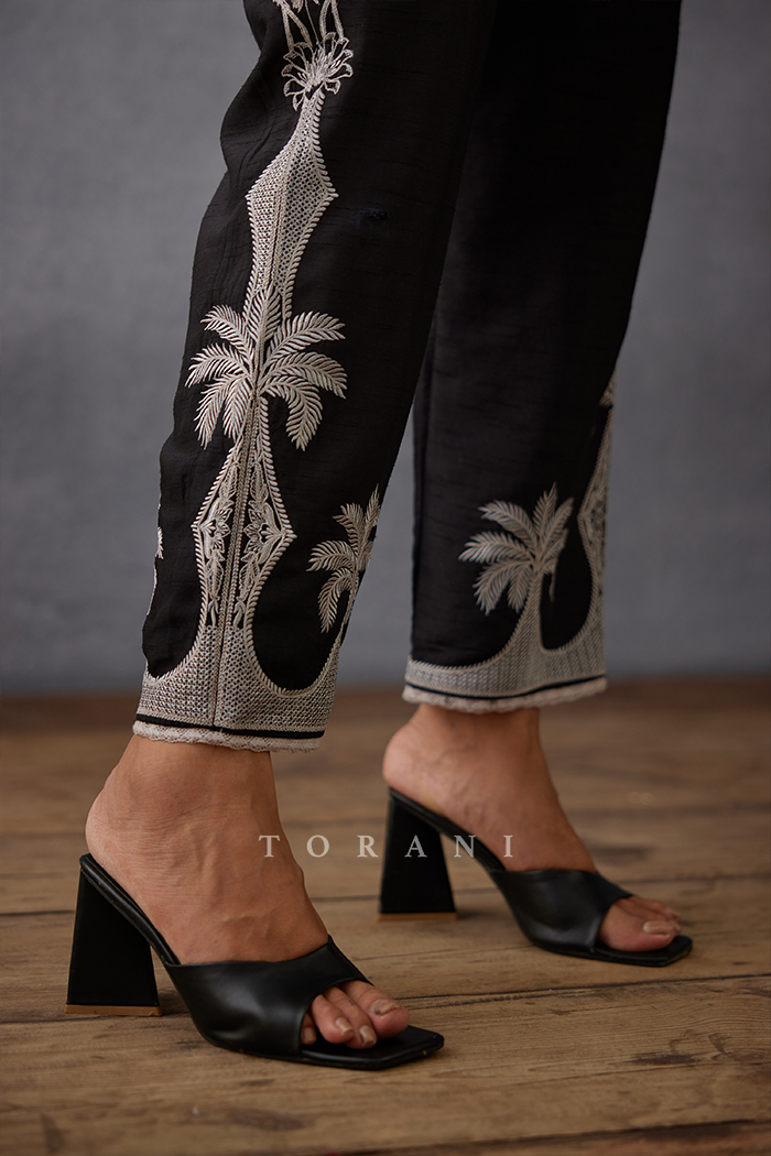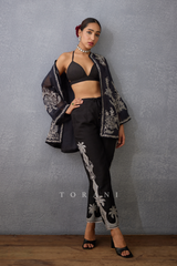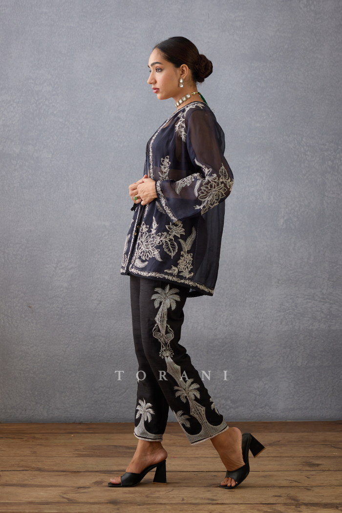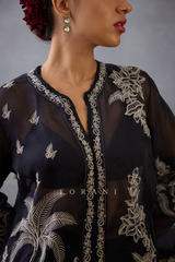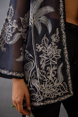 This Raat Rani Aabia Co-ord Set features exquisite Hand embroidery and Block-print on luxurious Silk Organza. Its timeless black color makes this classic piece a must-have for any wardrobe. Perfect for special occasions, its high-quality construction ensures it retains its elegance and beauty for years to come.