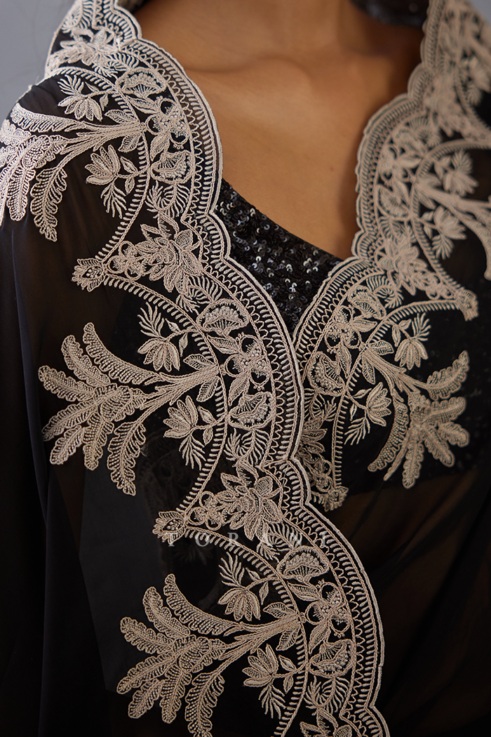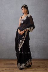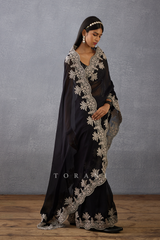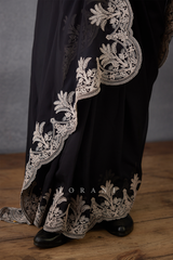 The Raat Rani Afrah Saree is an elegant and one-of-a-kind piece featuring a luxurious Silk Organza fabric and intricate Hand Embroidery work. The sophisticated black hue makes it an excellent choice for formal events or special occasions.