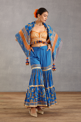 Make a fashion statement with the Rang Shyam Akashi Scarf. It features a Persian blur Bhagalpuri Jaal design printed on Slub Silk fabric, with a sheer Hand Block printed border for an extra touch of style. The beautiful blue and orange color palette offers a unique look. Digital Bhagalpuri printing technique results in a high-quality, long-lasting product.