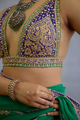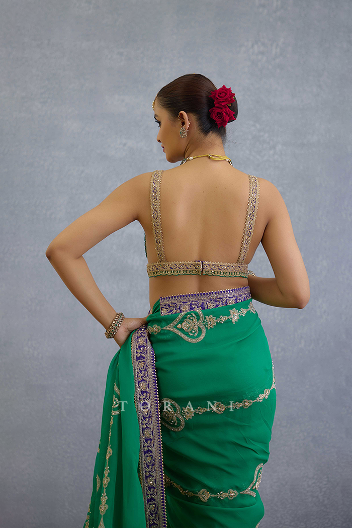 The Raqse Aanam Blouse is crafted from Jeni silk and embroidered with intricate dori work, traditional dabka and badla work in rose gold and gold threads, along with delicate pearl detailing for an enchanting look. Wear it as a choli or pair it with a saree—the elegance of this blouse is unmatched in every way.