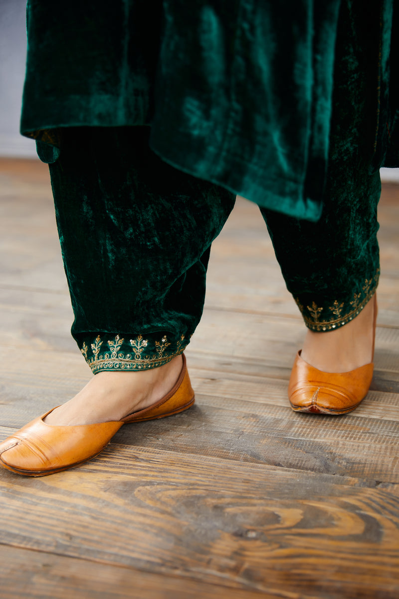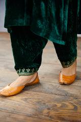 The Sabz Aakifah Co-ord Set is a gorgeous three-piece set that includes a silk velvet Kurta and Salwar. It is beautifully crafted with exquisite hand embroidery in a gorgeous green hue. Luxurious and timeless, this set is perfect for special occasions.