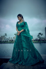 Experience sophistication in this elegant Sabz Mehreen Passa Lehenga Set. Crafted from organza and net in bottle green, this set is embellished with intricate hand and machine embroidery. Perfect for your special occasions, this set will make you look gorgeous and stunning.